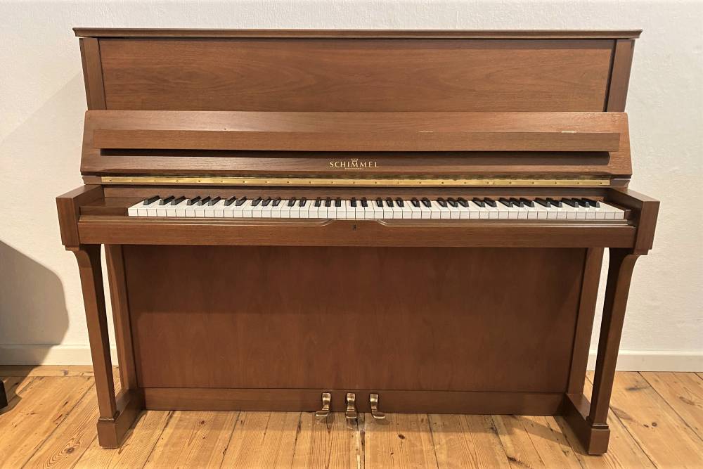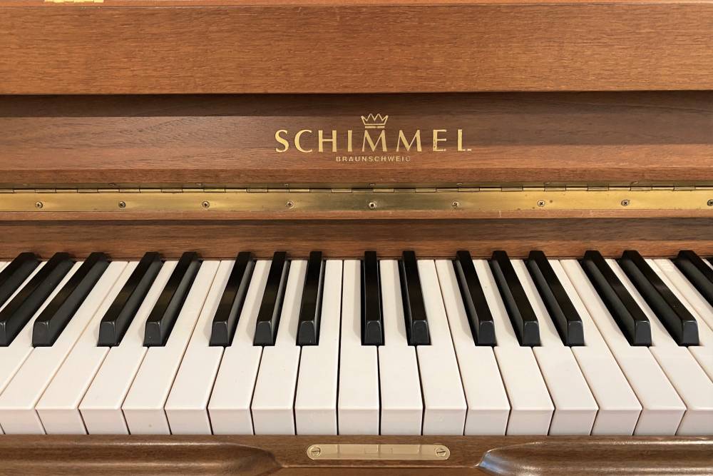Starten Sie Ihre musikalische Reise flexibel: Mieten Sie dieses gebrauchte Schimmel Klavier 118T in Nussbaum und überzeugen Sie sich vom wundervollen Klang, der berührt.