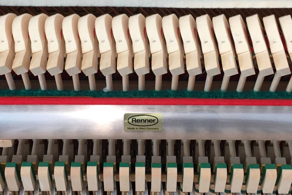 Herzstück des Instruments ist die Renner-Mechanik, die oft als Goldstandard im deutschen Klavierbau bezeichnet wird und für höchste Präzision und Zuverlässigkeit steht. Sie ermöglicht einen äußerst sensiblen und differenzierten Anschlag, der Pianisten eine unvergleichliche Kontrolle über den Klang verleiht.